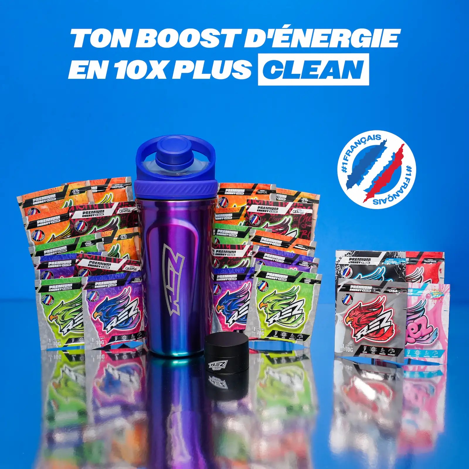 Découvre Rez, le N°1 français 🇫🇷 de l'energy drink: Sans sucre, 10x moins calorique, et avec 4h d’énergie sans crash ⚡