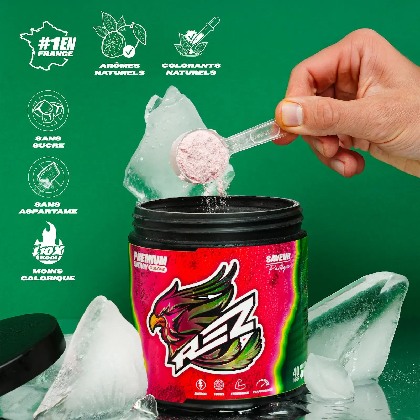 Découvre Rez, le N°1 français 🇫🇷 de l'energy drink: Sans sucre, 10x moins calorique, et avec 4h d’énergie sans crash ⚡